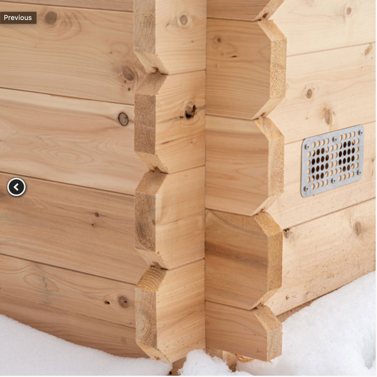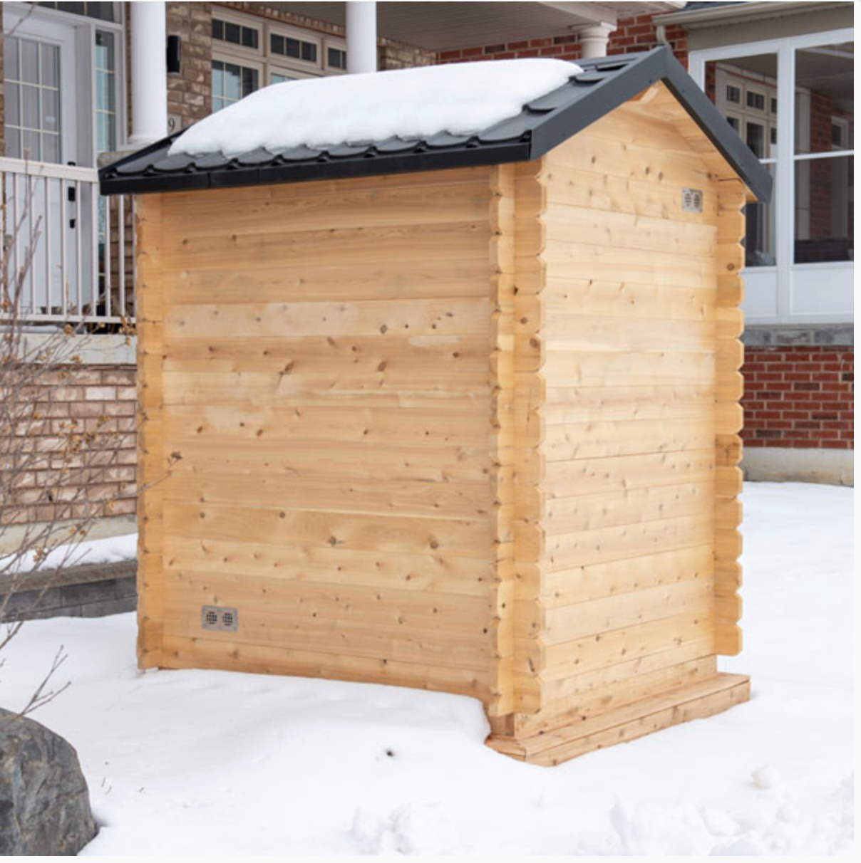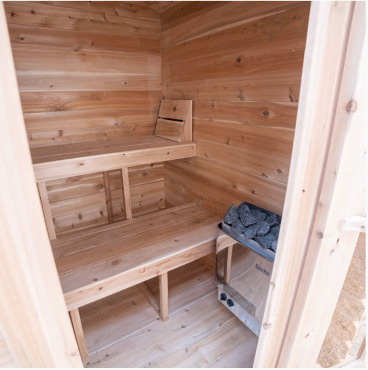 Built with 1.5" (35 mm) thick walls and roof boards, the Granby Cabin Sauna heats quickly and efficiently, making it ideal for frequent use. Its compact 6' × 6' (182 × 182 cm) footprint fits comfortably into smaller outdoor spaces while still offering ample room for 2–3 people to relax.